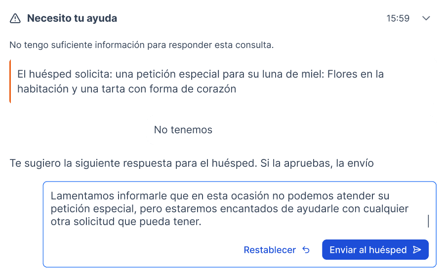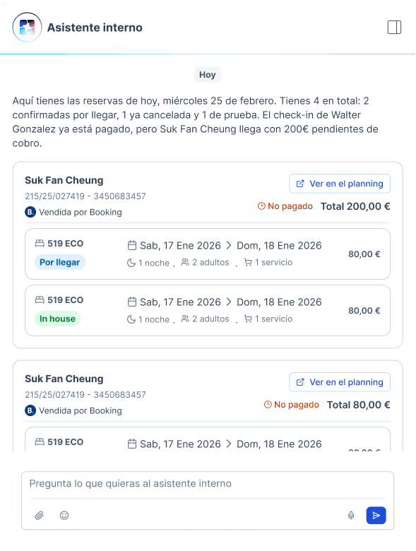 Convierte consultas en reservas sin esperas: BookAI acompaña a tus huéspedes paso a paso en creación de reservas, modificaciones o cancelaciones.