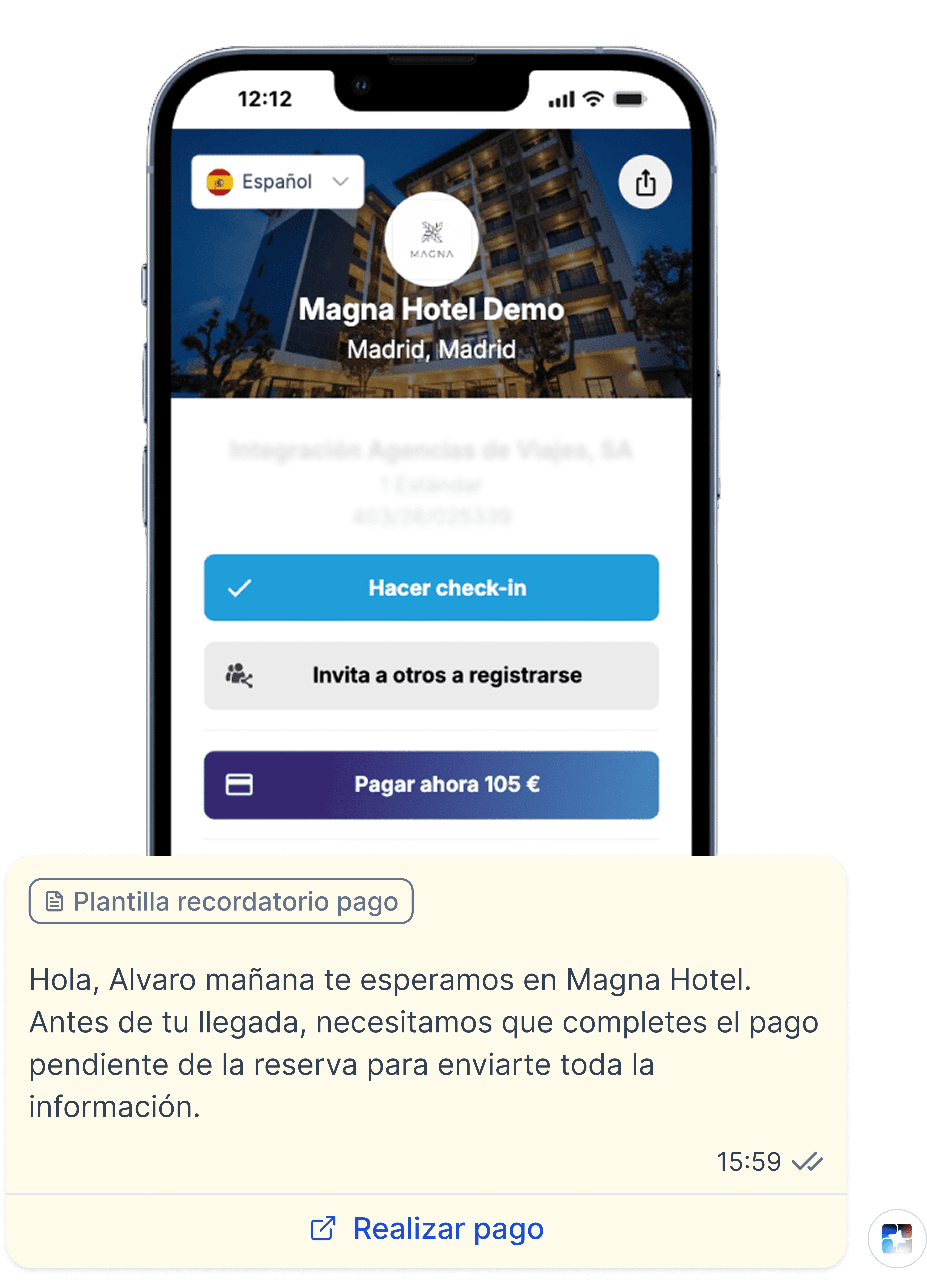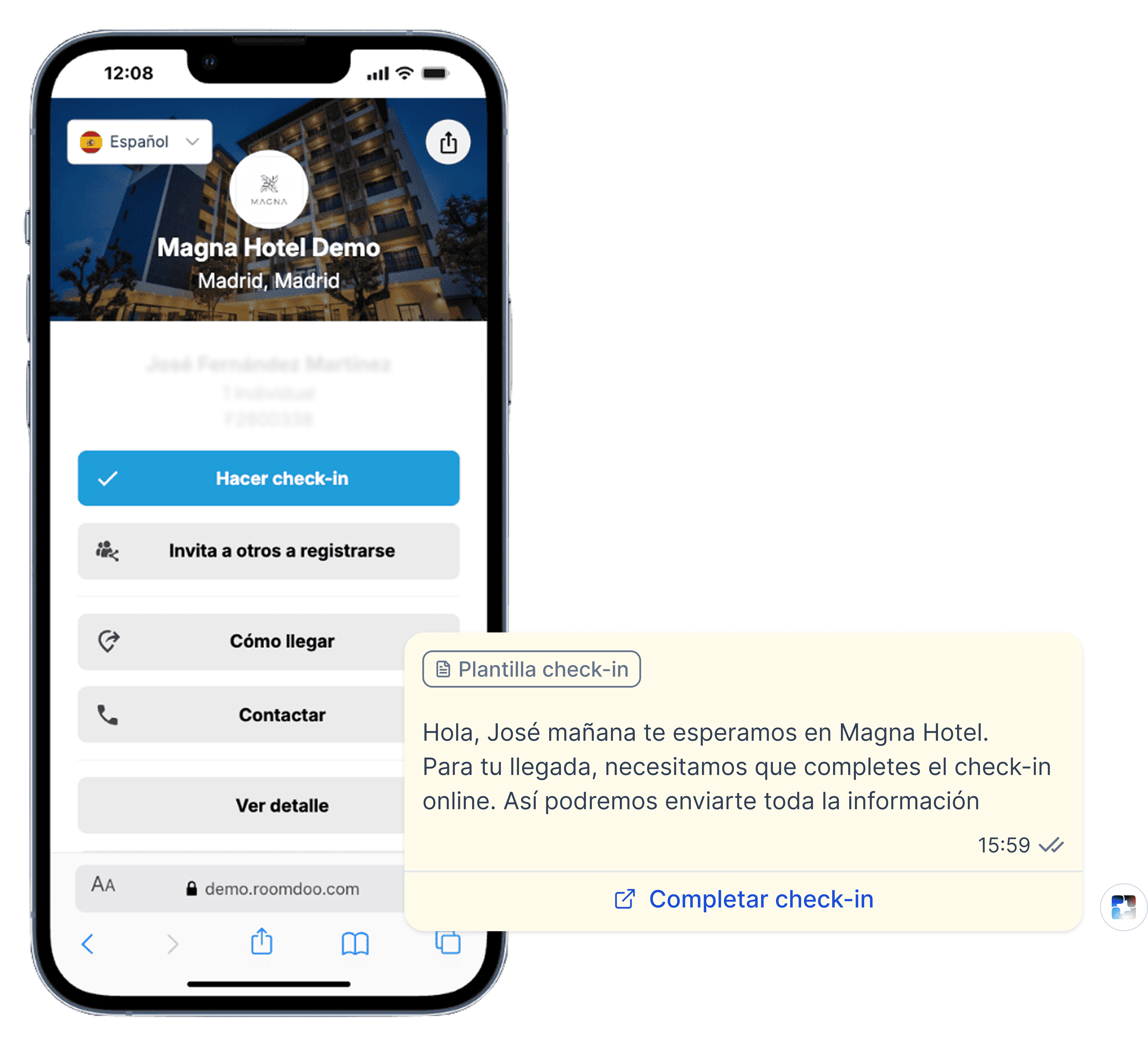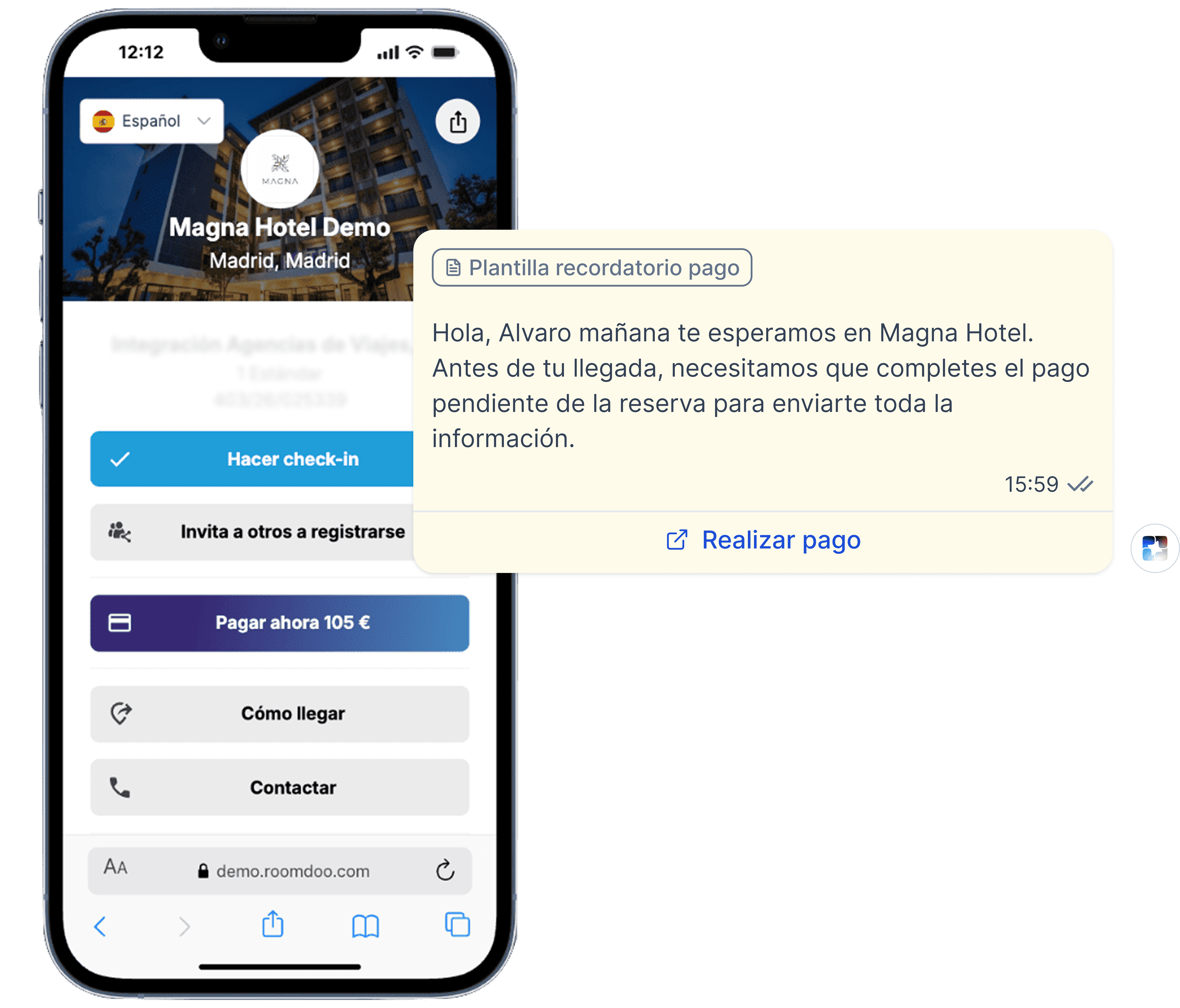 Antes de la llegada, durante la estancia o antes del check-out: todo gestionado y automatizado desde Roomdoo. Configura recordatorios y envía plantillas configurables para confirmar reservas, completar pagos o check-in online, enviar información del hotel o evaluar la estancia. Personalizadas y en diferentes idiomas.