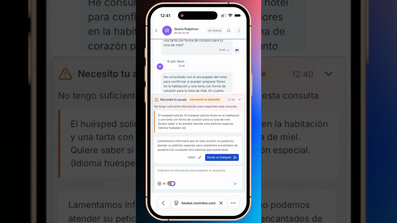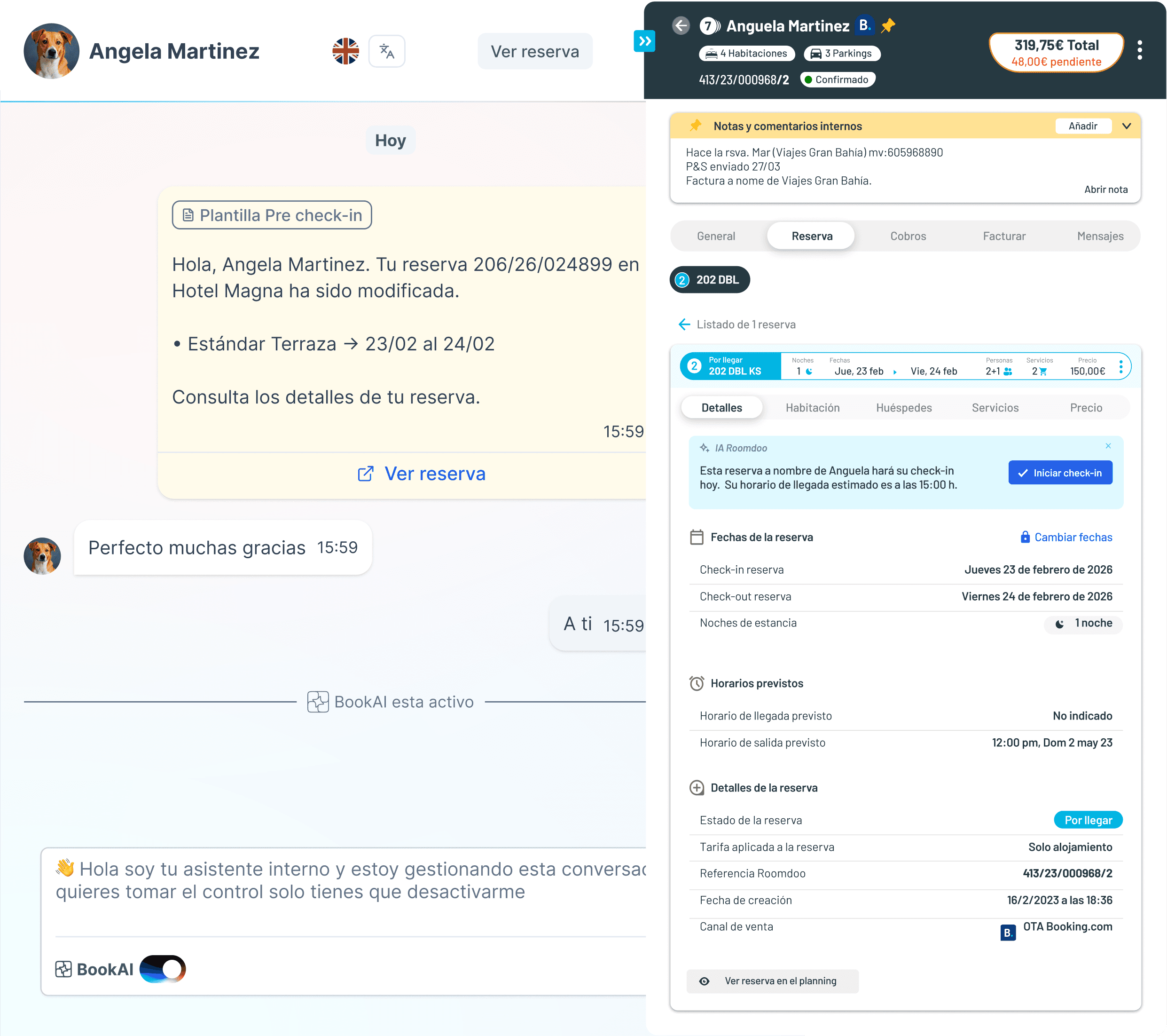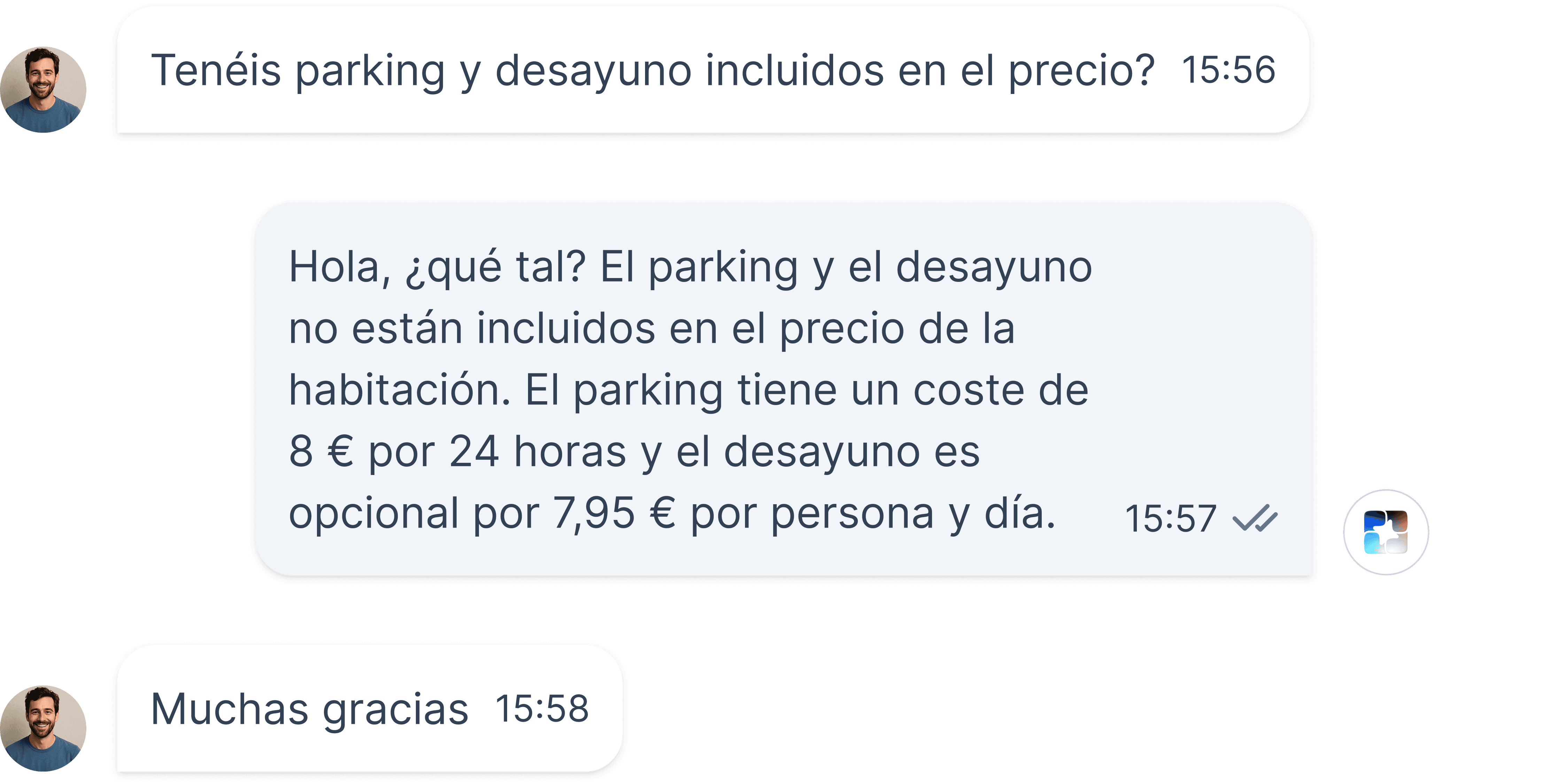 BookAI responde a tus huéspedes al instante, con precios y disponibilidad sincronizados desde Roomdoo. Y lo mejor: siempre puedes tomar el control